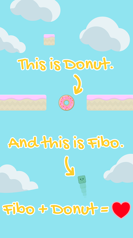 Meet Fibo. Fibo Nochy. Fibo is a Cube and he loves eating donuts with sugary fillings. All of them. The more, the better. Help Fibo jump and zigzag his way through endless bars of creamy chocolate and sticky candy. Help him eat all the donuts on his way up to Hot Donut Heaven. Are you ready to meet your Donut Maker? How many donuts can you eat? 1, 2, 3, 5, 8, 13, 21, 34, 55, 89, 144...?