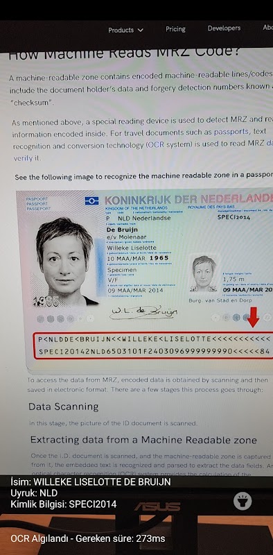 ECE MRZ Reader অ্যাপ্লিকেশনটি আইডি কার্ড বা পাসপোর্টে MRZ কোডগুলি পড়ে এবং যাত্রীদের তথ্য EBSAcente অ্যাপ্লিকেশনে প্রেরণ করে।