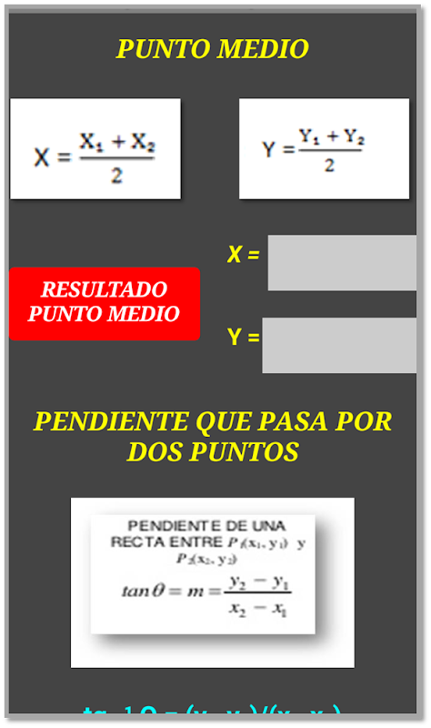 ES UNA CALCULADORA QUE AYUDA A COMPROBAR LOS RESULTADOS DE LOS EJERCICIOS EN GEOMETRÍA ANALÍTICA, PARA ENCONTRAR LA ECUACIÓN DE LA RECTA CON PUNTO PENDIENTE, OTRA QUE PASA POR DOS PUNTOS, OTRA CON ECUACIÓN GENERAL, DISTANCIA, PUNTO MEDIO, PENDIENTE, ÁNGULO DE INCLINACIÓN, ABSCISA AL ORIGEN, ORDENADA AL ORIGEN, PUNTO QUE DIVIDE UN SEGMENTO EN UNA RAZÓN DADA, PERÍMETRO Y ÁREA DE CUALQUIER TRIÁNGULO, TEOREMA DE PITÁGORAS, PERÍMETRO DE CUADRILÁTEROS Y HAY EJEMPLOS RESUELTOS DE ALGUNOS EJERCICIOS.