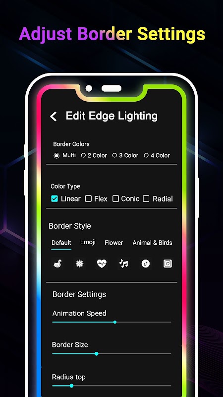 - এজ লাইট অ্যাপের গোলাকার কর্নার আপনার ডিভাইসের আকার এবং আকার অনুযায়ী পরিবর্তন করা যেতে পারে