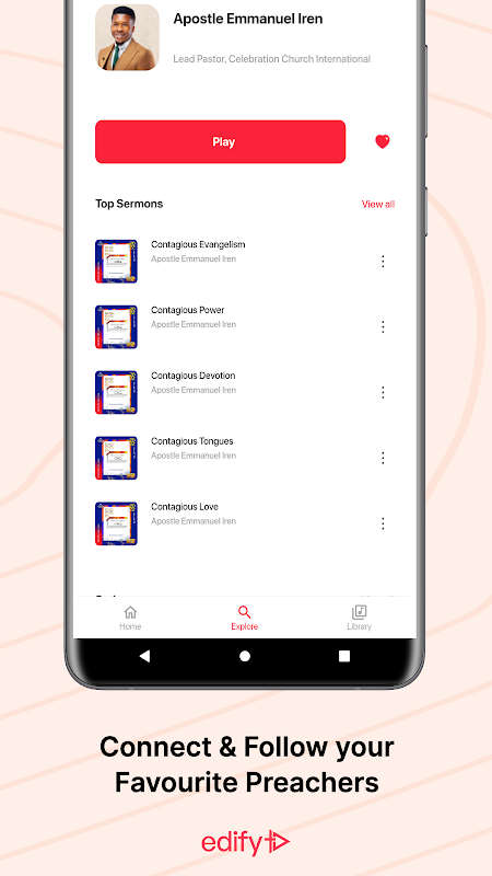 চাহিদা অনুযায়ী খ্রিস্টান ধর্মোপদেশের চূড়ান্ত গন্তব্য Edify-এ স্বাগতম! আমাদের অ্যাপের সাহায্যে, আপনি যে কোনো সময় এবং যে কোনো জায়গায় বিশ্বজুড়ে বিখ্যাত যাজক এবং বক্তাদের অনুপ্রেরণামূলক ধর্মোপদেশের একটি বিশাল লাইব্রেরি অ্যাক্সেস করতে পারেন।