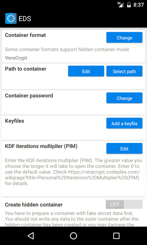 EDS (এনক্রিপ্ট করা ডেটা স্টোর) হল Android এর জন্য একটি ভার্চুয়াল ডিস্ক এনক্রিপশন সফ্টওয়্যার যা আপনাকে আপনার ফাইলগুলিকে একটি এনক্রিপ্ট করা পাত্রে সংরক্ষণ করতে দেয়৷ VeraCrypt(R), TrueCrypt(R), LUKS, EncFs, CyberSafe(R) কন্টেইনার প্রকার সমর্থিত।
