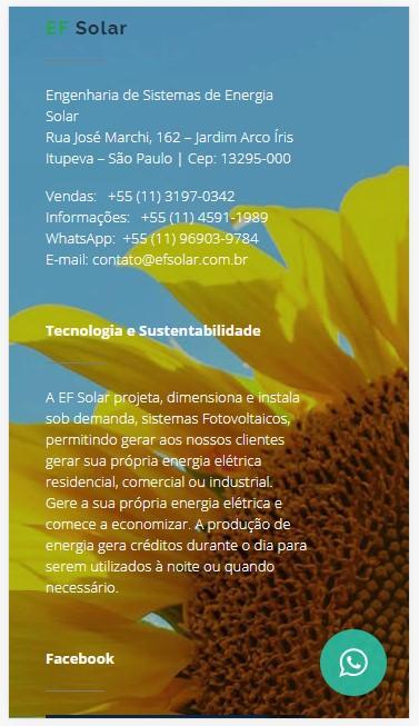 A EF Solar é uma integradora de soluções em energia solar e eficiência energética. Projetamos, dimensionamos e instalamos sob demanda, sistemas Fotovoltaicos, de acordo com a Resolução Normativa ANEEL n.o 482, permitindo gerar aos nossos clientes gerar sua própria energia elétrica para sua residência, comércio ou indústria, certificado pela concessionária de energia através do sistema “on-grid”, onde a produção de energia gera créditos durante o dia para serem utilizados à noite ou quando necessário. Os projetos são registrados no CREA, e nosso parceiro de tecnologia é a Renovigi com produtos certificados pelo IMMETRO e ANATEL.