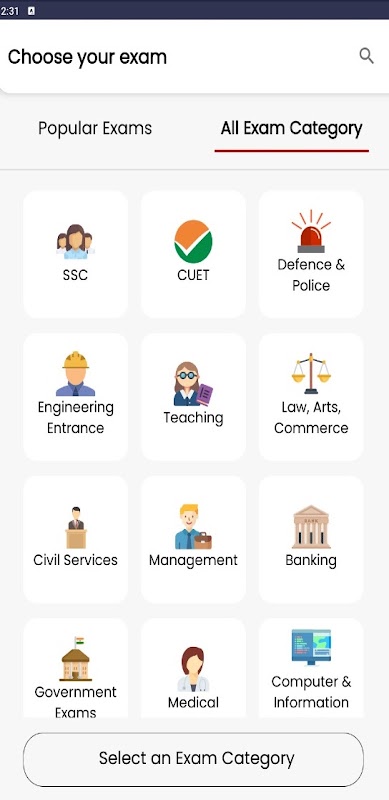 একটি বিস্তৃত পরীক্ষার সিরিজ অন্বেষণ করুন, ব্যবহারকারী-বান্ধব অনুসন্ধান এবং নির্বাচন বৈশিষ্ট্য ব্যবহার করে একাধিক পরীক্ষা নেভিগেট করুন, সবগুলি একটি একক স্ক্রিনে সুবিধাজনকভাবে অ্যাক্সেসযোগ্য৷