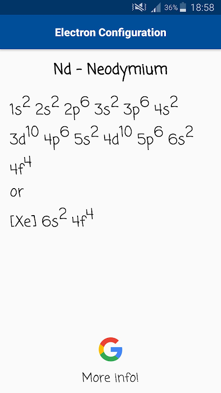 ইলেকট্রন কনফিগারেশন বিশেষত ছাত্রদের জন্য তৈরি একটি রসায়ন অ্যাপ্লিকেশন, কিন্তু এছাড়াও রসায়ন উত্সাহীদের জন্য উপকারে আসে. উভয় তালিকায় বা এক টাইপ থেকে একটি উপাদান নির্বাচন করুন: একটি সহজ এবং চমৎকার ইউজার ইন্টারফেস উপর ভিত্তি করে, অ্যাপ্লিকেশন আপনি দুটি বিকল্প দেয়. উপাদান এর ইলেক্ট্রন কনফিগারেশন টোকা গুগল আইকন সম্পর্কে আরো তথ্যের জন্য.