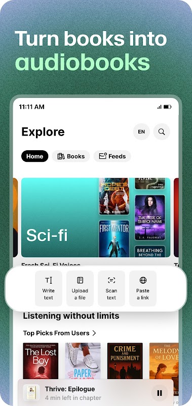 দস্তাবেজগুলি আপলোড করুন, পাঠ্য পেস্ট করুন, ওয়েব লিঙ্কগুলি খুলুন, বা ফাইলগুলি আমদানি করুন — তারপরে বসুন কারণ ElevenReader সেগুলিকে সমৃদ্ধ অডিওবুকে পরিণত করে৷