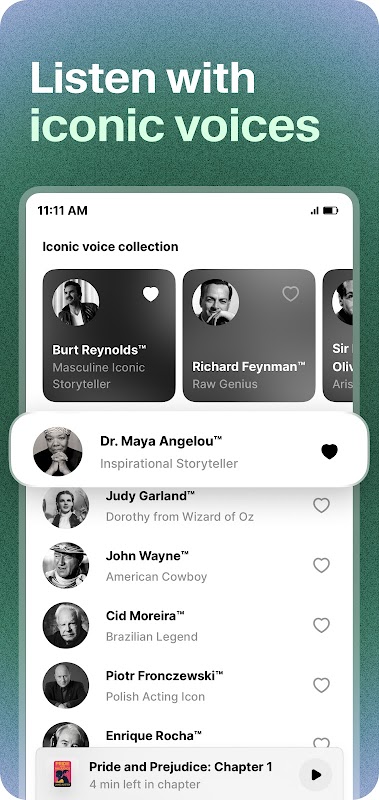 আগের মতো অডিওবুকগুলি অনুভব করুন৷ ElevenReader আপনাকে কিংবদন্তি কণ্ঠের দ্বারা বর্ণিত ক্লাসিক এবং নতুন প্রকাশ শুনতে দেয় — বার্ট রেনল্ডস, জুডি গারল্যান্ড, জেমস ডিন এবং মায়া অ্যাঞ্জেলো থেকে দীপক চোপড়া এবং রিচার্ড ফাইনম্যান পর্যন্ত। এটি সবচেয়ে জাদুকরী - প্রাকৃতিক, অনুপ্রেরণাদায়ক এবং স্বপ্নের মতো AI অডিও।