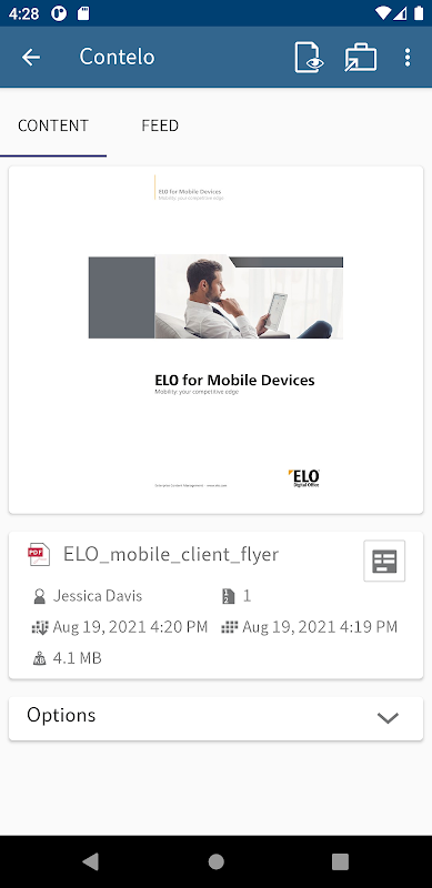 ELO অ্যাপের মাধ্যমে, আপনি একটি মোবাইল ডিভাইস ব্যবহার করে আপনার কোম্পানির ELO সংগ্রহস্থল অ্যাক্সেস করতে পারেন। অ্যাপটি আপনার নথি এবং সমস্ত সম্পর্কিত বিশদগুলিতে দ্রুত অ্যাক্সেস সরবরাহ করে। আপনি অফিসের বাইরে থাকাকালীন নথিগুলি ক্যাপচার এবং ফাইল করতে পারেন এবং ELO-তে তথ্য অনুসন্ধান করতে পারেন।