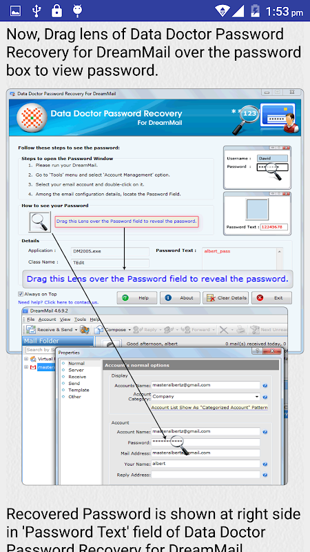 অ্যাপ্লিকেশন পাসওয়ার্ড উম্মোচন করতে & পদক্ষেপ পাসওয়ার্ড আস্টেরিক্স বা বিন্দু এর Windows এর জন্য নিজ নিজ ডেটা ডক্টর পাসওয়ার্ড রিকভারি সফটওয়্যার ব্যবহার করে পিছনে লুকানো রূপান্তর করতে অনাবৃত পরামর্শ দেয়. ডেটা ডক্টর পাসওয়ার্ড রিকভারি সফটওয়্যার যেমন জিমেইল হটমেইল দৃষ্টিভঙ্গী ইয়াহু এওএল ইত্যাদি হিসাবে সংরক্ষিত ওয়েবসাইটের সব ধরনের ইমেইলের সকল প্রকার কনফিগার ইমেইলের সব ধরনের পাসওয়ার্ড এবং সেইসাথে জনপ্রিয় ইমেইল সেবা প্রকাশ SSL- র মাধ্যমে নির্বিশেষে আপনার কনফিগার করা POP3 SMTP এর বা IMAP ভিত্তিক সেটিংস TSL বা মান প্রমাণীকরণ সেটিংস.