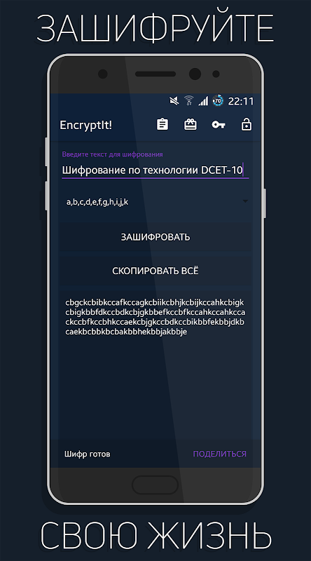 This application will encrypt your text on a new encryption technology - DCET-10! This provides a double protection for your text!