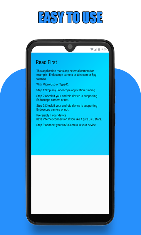 এন্ডোস্কোপ ক্যামেরা সংযোজক একটি অ্যাপ্লিকেশন আপনার ফোনটি এন্ডোস্কোপ ক্যামের সাথে সংযুক্ত করে বা কোনও ইউএসবি ক্যামেরা বা বোরস্কোপ ক্যামেরা ডিস্টেস্টের মতো কোনও ডিভাইস, নর্দমা পরিদর্শন ক্যামেরা এমন অনেকগুলি ডিভাইস রয়েছে যা পরিদর্শন ক্যামেরা নর্দমার মতো বহিরাগত ক্যাম ব্যবহার করে।