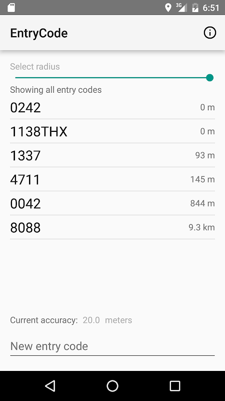 The app shows your nearby entry codes in a list. To see entry codes from locations further away, move the slider right. To narrow the search, move the slider left.