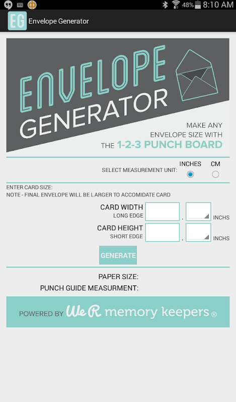 Simply input the size of the card you need an envelope for and the Envelope Generator app will tell you what size paper you need and which punch guide to use.