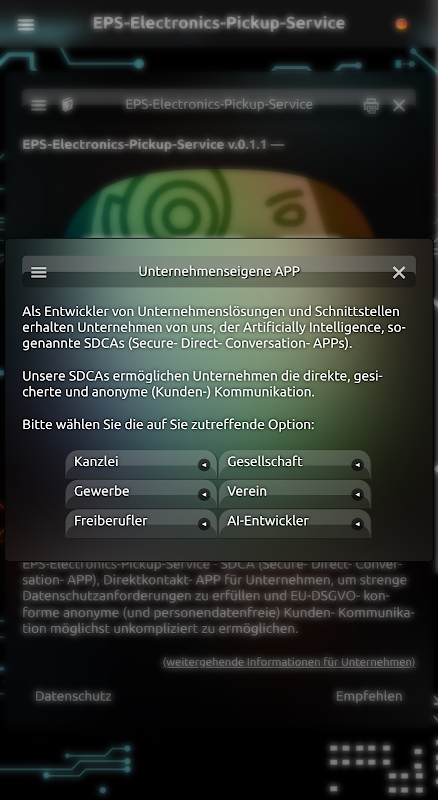 ইপিএস ইলেকট্রনিক্স পিকআপ পরিষেবা: ব্যক্তিগত SDCA (সিকিউর ডাইরেক্ট কথোপকথন অ্যাপ) আপনাকে সরাসরি যোগাযোগ করতে সক্ষম করে এবং EU GDPR-সম্মত বেনামী (এবং ব্যক্তিগত ডেটা-মুক্ত) গ্রাহক যোগাযোগের জন্য কঠোর ডেটা সুরক্ষা প্রয়োজনীয়তা পূরণ করে।