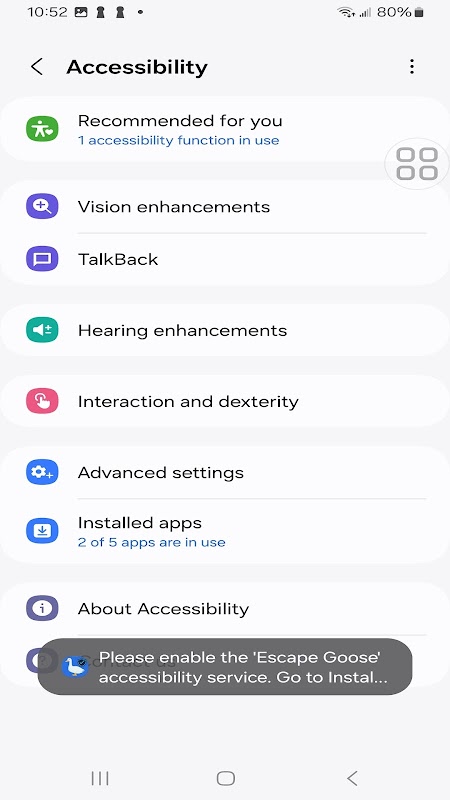 Escape Goose আপনাকে আপনার ডিজিটাল জীবনের নিয়ন্ত্রণ নিতে দেয়। আপনার ফোনে সোশ্যাল মিডিয়া, গেমিং এবং অন্যান্য অকেজো কার্যকলাপে আপনি যে অগণিত ঘন্টা নষ্ট করেন সেগুলি এড়িয়ে যান। আমরা আপনাকে খুব সহজে সাইট এবং অ্যাপগুলিকে ব্লক করার অনুমতি দেওয়ার জন্য একটি স্বজ্ঞাত উপায় ব্যবহার করি। এটি অ্যাক্সেসিবিলিটি পরিষেবা ব্যবহার করে। অ্যাপে "পরিষেবা সক্ষম করুন" এ যান, তারপরে "ইনস্টল করা অ্যাপস" তারপরে "এস্কেপ গুজ" নির্বাচন করুন। অবশেষে, অ্যাক্সেসিবিলিটি পরিষেবাটি চালু করুন। পরিষেবাটি ব্লক করা অ্যাপ এবং ওয়েবসাইটগুলির জন্য নিরীক্ষণ করতে ব্যবহৃত হয়। উপরন্তু, ব্লক করা অ্যাপ এবং ওয়েবসাইটের উপর একটি ব্লক স্ক্রিন প্রদর্শন করতে আমাদের একটি ওভারলে অনুমতি (অ্যাপের মাধ্যমে সক্ষম) প্রয়োজন।