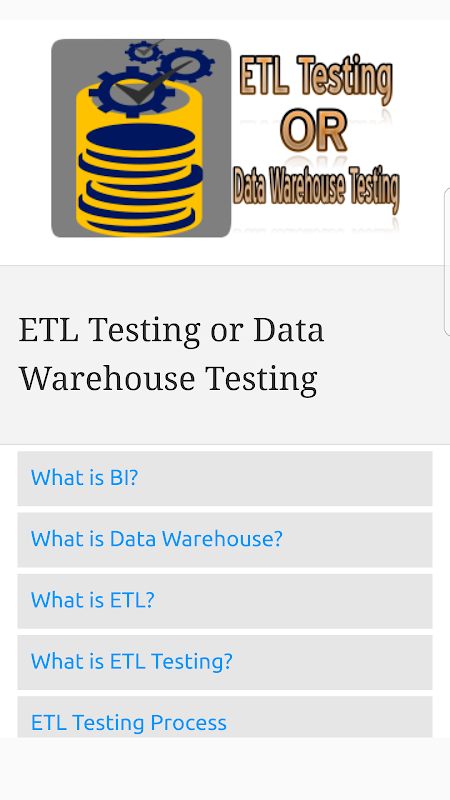 -> ETL Testing Tutorials Offline App come with complete comprehensive and responsive layout.