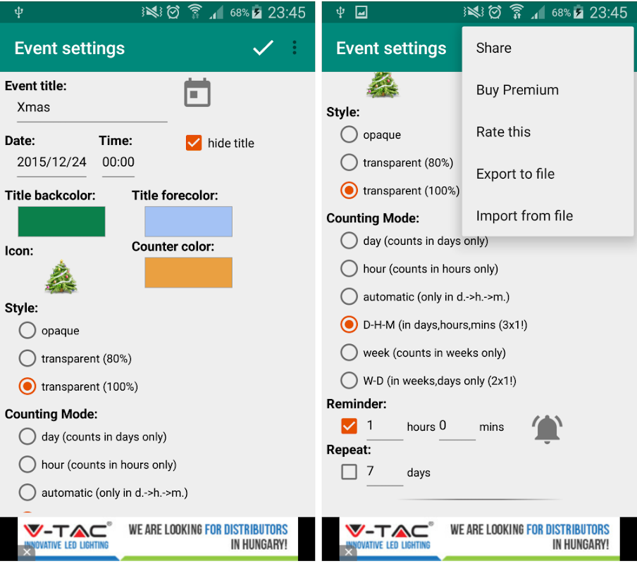 -- স্বয়ংক্রিয় (শুধুমাত্র দিন মোডে ডিফল্ট -> শেষ দিনে শুধুমাত্র ঘন্টা মোডে স্যুইচ করুন -> শেষ পর্যন্ত শুধুমাত্র শেষ ঘন্টায় মিনিট দেখায়, ইভেন্টের তারিখ + সময়ও ব্যবহার করুন।)