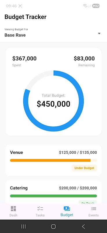 * **বাজেট ট্র্যাকার:** "আন্ডার বাজেট" এবং "অন ট্র্যাক" স্ট্যাটাস সূচক সহ ব্যয়ের বিস্তারিত ভিজ্যুয়াল ব্রেকডাউন।