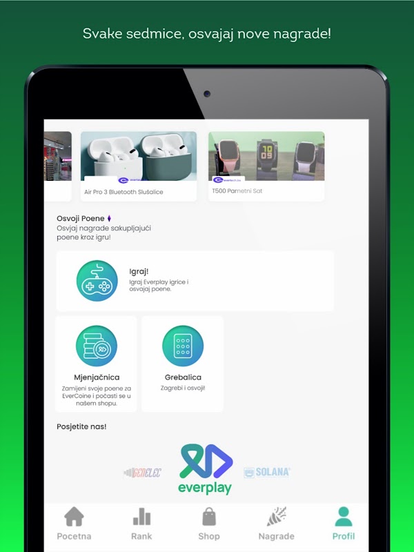 EverPlay হল একটি পুরষ্কার অ্যাপ্লিকেশন যা আপনাকে মজাদার সামগ্রীর মাধ্যমে পয়েন্ট সংগ্রহ করতে দেয় যা স্পনসর পুরষ্কার জেতার দিকে পরিচালিত করে। এটি অ্যাপ্লিকেশন ব্যবহারকারীদের প্রতি সপ্তাহে একটি স্বচ্ছ, প্রতিযোগিতামূলক এবং মজাদার উপায়ে পুরস্কার জিততে অফার করে!