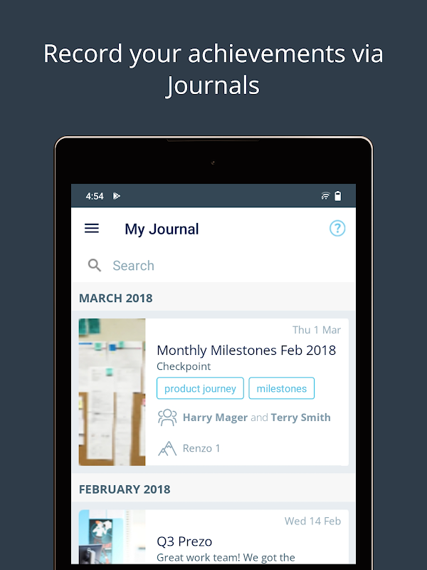 কর্মচারীরা যেতে যেতে সাফল্য এবং প্রতিক্রিয়া ক্যাপচার করতে পারেন। এটি অন্যদের সাথে ভাগ করুন (বিশেষ করে তাদের পরিচালকদের), এবং তাদের চলমান সাফল্যগুলিকে তাদের লক্ষ্যগুলির সাথে লিঙ্ক করুন। এমনকি সেই দুর্দান্ত মুহূর্তটি ক্যাপচার করতে একটি ফটো বা সেলফি তুলুন।