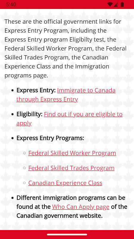এই অ্যাপ্লিকেশন "এক্সপ্রেস এন্ট্রি গাইড" কানাডা সরকার বা IRCC দ্বারা অনুমোদিত, অনুমোদিত বা স্পনসর করা হয় না। এটি একটি তৃতীয় পক্ষের নির্দেশিকা যা ব্যবহারকারীদের এক্সপ্রেস এন্ট্রি প্রোগ্রাম নেভিগেট করতে সাহায্য করার জন্য তৈরি করা হয়েছে। সমস্ত তথ্য কানাডা সরকারের অফিসিয়াল ওয়েবসাইট থেকে নেওয়া হয়, এবং ব্যবহারকারীদের সর্বদা সবচেয়ে সঠিক এবং আপ-টু-ডেট তথ্যের জন্য অফিসিয়াল উত্সগুলি উল্লেখ করা উচিত।
