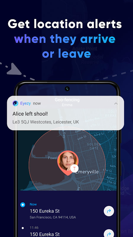 Eyezy এর লোকেশন শেয়ারিং এবং GPS ফোন ট্র্যাকার বৈশিষ্ট্যগুলির সাহায্যে, আপনি সর্বদা আপনার প্রিয়জন কোথায় আছেন তা জানতে পারবেন এবং নিশ্চিত করতে পারবেন যে তারা নিরাপদ।