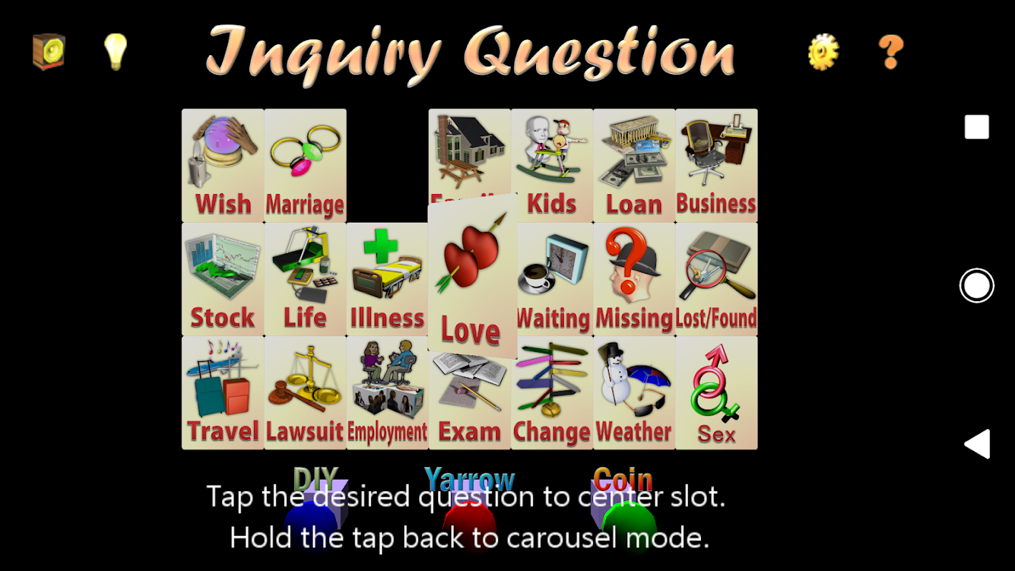 ইচ্ছা, বিয়ে, প্রেম, পরিবার, বাচ্চা, ঋণ, ব্যবসা, স্টক, জীবন, অসুস্থতা, অপেক্ষা, নিখোঁজ, হারিয়ে যাওয়া/পাওয়া, ভ্রমণ, মামলা, চাকুরী, সহ মানবজাতির জীবনযাত্রার সমস্ত দিক কভার করে 19টি প্রশ্ন অনুসন্ধানের জন্য উপলব্ধ। পরীক্ষা, পরিবর্তন, এবং আবহাওয়া।