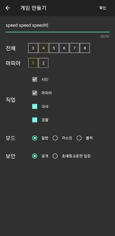 직업: 마피아, 시민, 의사, 경찰 (추가 예정)