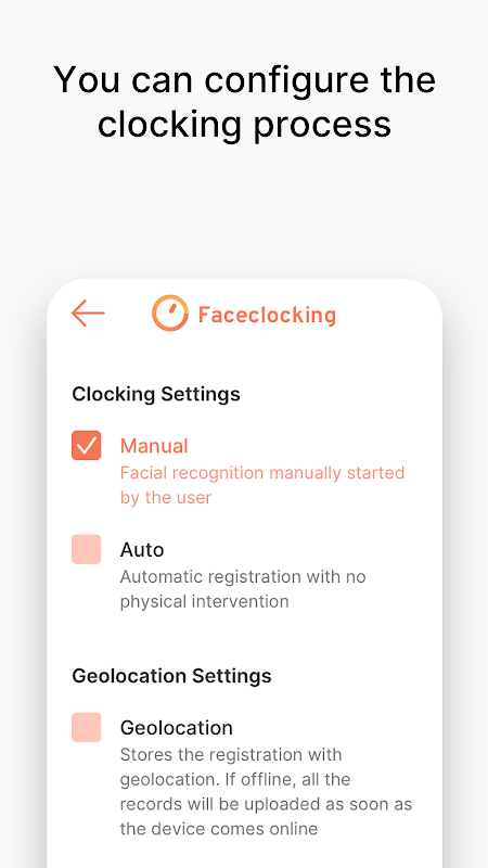 O processo de registo de ponto nunca foi tão fácil! Registe entradas e saídas sem necessidade de interação física. Se estive offline, a aplicação guardará os seus registos com recurso a geolocalização. Assim que existir ligação, os registos serão carregados em lacunas. A biometria facial dificulta também a falsificação de registos ao invés da utilização de outros métodos de picagem de ponto.