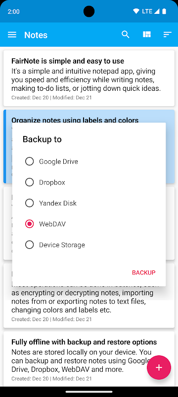 Google ড্রাইভ, ড্রপবক্স, ইয়ানডেক্স ডিস্ক, ওয়েবডিএভি বা ডিভাইস স্টোরেজ ব্যবহার করে নোটগুলির ব্যাক আপ এবং পুনরুদ্ধার করুন