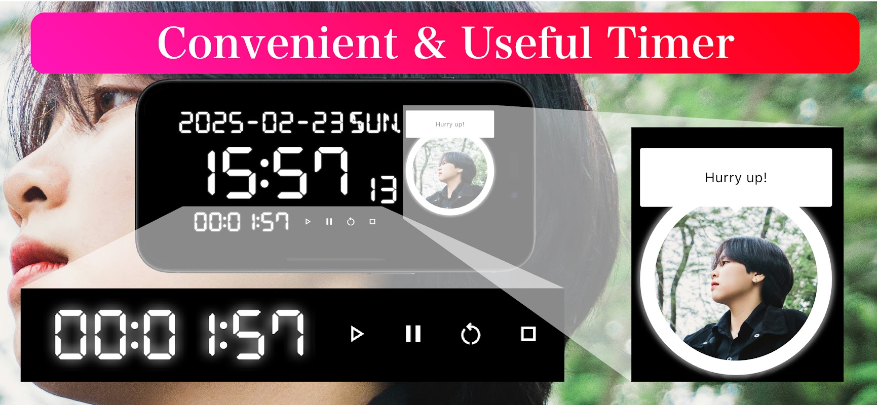 এই অ্যাপের সাহায্যে, আপনি আপনার পক্ষপাত, প্রিয় মূর্তি, বা প্রিয় চরিত্রের ফটো এবং বার্তাগুলিকে সময়ের পাশে প্রদর্শন করতে পারেন। সকাল হোক, রাত হোক বা মাঝখানে যেকোন ঘন্টাই হোক, আপনি সময় চেক করার সময় কে আপনার দিকে ফিরে হাসবে তা আপনি সিদ্ধান্ত নেন।