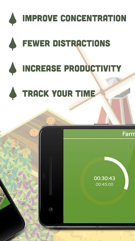 Phone একটি টাইমার your আপনার ফোনটি নীচে রাখার জন্য এবং আপনার ফসলের বৃদ্ধি পেতে নিজেকে চ্যালেঞ্জ জানাতে।