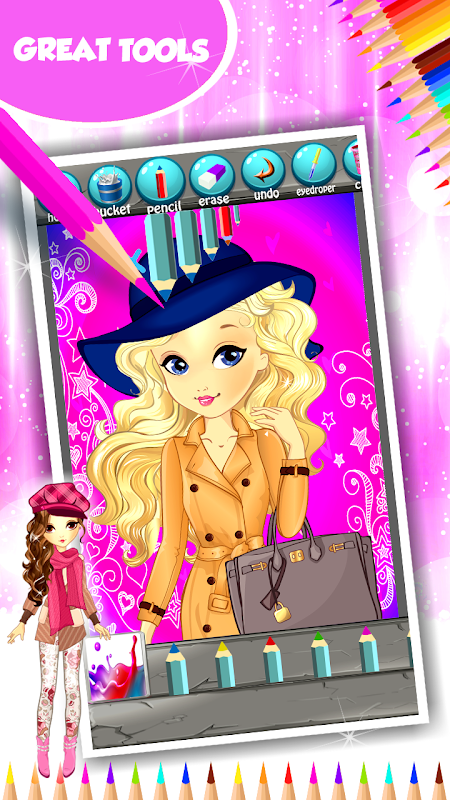 Explore the magnificent top outfits and they may give you an idea what to wear and for which occasion. There are also sensational hairstyles so do not think twice but browse the coolest sketches and express your creativity. Download free the latest Fashion Girl Coloring Book app on your phone and you will be enchanted with the loveliest lady wearing casual dress in combination with flip-flops and wide brim floppy hat. There are suitcases next to her and it is obvious that she has just arrived at the beach of the tropical island for a magnificent vacation. Imagine that you are her and click the paint bucket and fill the gaps of this wonderful drawing. Make the best photo and use it to decorate your tablet and show how much you care about your style. This coolest game is intended both for children and adults so do not be shy because you are an adult, but play it. There is no reason not to get the popular fashion girl coloring application as it will also surprise your kids with magnificent illustrations.