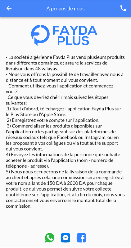5) আমরা গ্রাহকের কাছে অর্ডারটি সরবরাহের যত্ন নেব এবং তারপরে, প্রতিটি পণ্যের জন্য 150 DA থেকে 2000 DA পর্যন্ত আপনার নামে একটি কমিশন নিবন্ধিত হবে, যা আপনাকে অ্যাপ্লিকেশনটিতে আপনার দৈনিক সংগ্রহ অনুসরণ করতে দেয়, এবং মাসের শেষে, আমরা আপনার সাথে যোগাযোগ করব এবং আপনাকে কমিশনের মোট পরিমাণ পাঠাব।