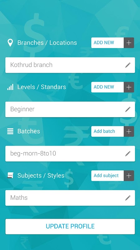 নৃত্য, সঙ্গীত, শিক্ষা - অ্যাপ ব্যবহারকারী কোনো কোচিং ক্লাসে কনফিগার করতে পারেন. এটি একাধিক শাখা ও প্রজাদের সমর্থন. ব্যবহারকারী প্রতিটি ছাত্র থেকে সংগৃহীত ফি ট্র্যাক করতে পারেন. যদিও উপস্থিতি গ্রহণ, লাল মার্কার একটি ছাত্র যারা পূর্ণ ফি পরিশোধ করেনি ছাড়াও প্রদর্শিত হয়.