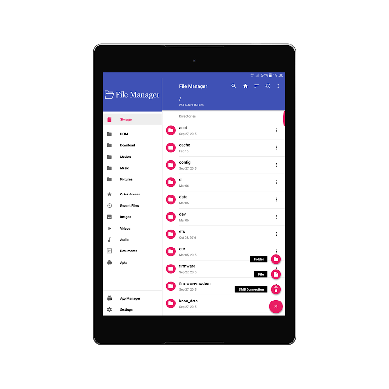 File Manager is a complete file manager that allows you to handle any file (Images, Music, Movies, Documents, app) manager for both local and networked use on your Android device via a clean and intuitive and based on Material Design guidelines interface.