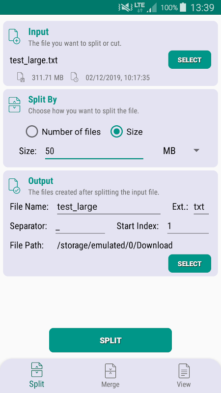 ফাইল স্প্লিটার এবং মার্জার একটি নিখরচায় অ্যান্ড্রয়েড সরঞ্জাম যা আপনাকে যে কোনও ফাইলকে ছোট ফাইলগুলিতে বিভক্ত করতে বা একাধিক ফাইল এক সাথে একীভূত করতে দেয়।