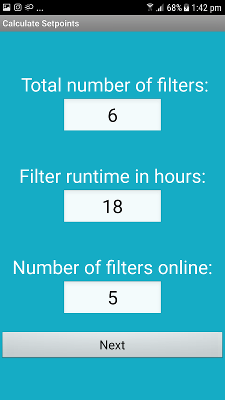 আপনি ফিল্টার এবং ফিল্টার রান টাইম সংখ্যা লিখে শুরু। তারপর প্রতিটি ফিল্টারের জন্য সমস্ত বর্তমান ফিল্টার সময় লিখতে। অ্যাপ্লিকেশন স্বয়ংক্রিয়ভাবে ঘণ্টা বাছা এবং দীর্ঘতম চলা ঘন্টা দিয়ে ফিল্টার প্রথম অগ্রাধিকার বরাদ্দ হবে। প্রতিটি ফিল্টারের জন্য নতুন ধৌত সেট পয়েন্ট ব্যবহার করুন। প্রতিটি ধৌত করার পর, তার মূল সেট বিন্দু ধৌত সেটিং পুনর্বহাল।