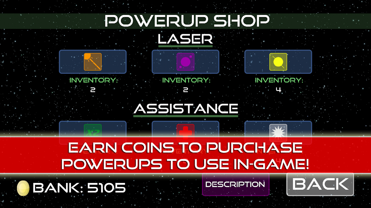 - Speed boosts, nuclear bombs, twin lasers, double points, asteroid piercing lasers, and extra health