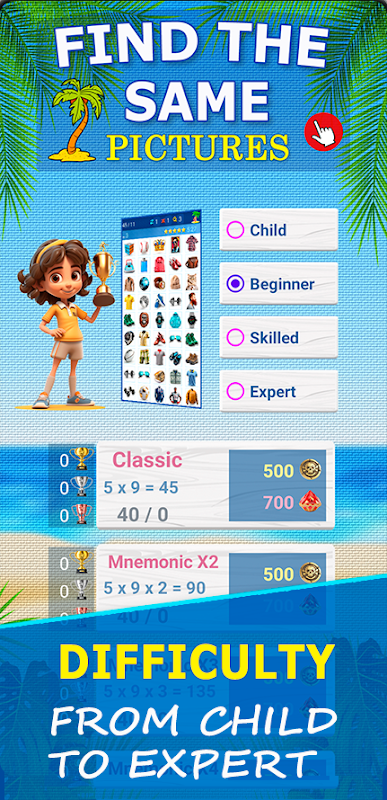 মেমোনিক X2, X3, X4 মোডগুলি অবশ্যই মানসিক কৌশলগুলির প্রেমীদের এবং তাদের স্মৃতি এবং মনোযোগের প্রশিক্ষণের লোকদের কাছে আবেদন করবে। স্ক্রিনের মধ্য দিয়ে স্ক্রোল করার সময়, একই ছবিগুলি খুঁজে পাওয়ার জন্য আপনাকে আগে কোন ছবিগুলি ছিল তা মনে রাখতে হবে।