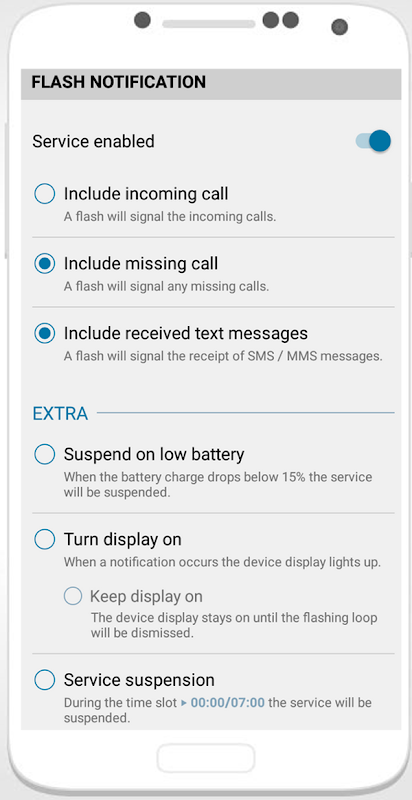 আপনি নির্দিষ্ট সময়ে ফ্ল্যাশ সতর্কতাও পেতে পারেন এবং আপনার ঝলকানো ফ্রিকোয়েন্সি পরিবর্তন করার বিকল্প রয়েছে যেমন আপনি যদি ফ্ল্যাশ সতর্কতাগুলি ধীর বা উচ্চতর করতে চান। আপনার কাছে অ্যাপ্লিকেশনটির অভ্যন্তর থেকে ফোন মোড নিয়ন্ত্রণ করা হবে যা সাধারণ মোড / নীরব মোড / ভাইব্রেট। আপনার কাছে অন / অফ দিয়ে বিশদভাবে জ্বলজ্বল সেট আপ করার বিকল্প রয়েছে।