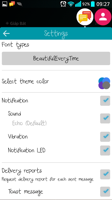 - Float SMS has personal settings (notification settings, custom fonts...)