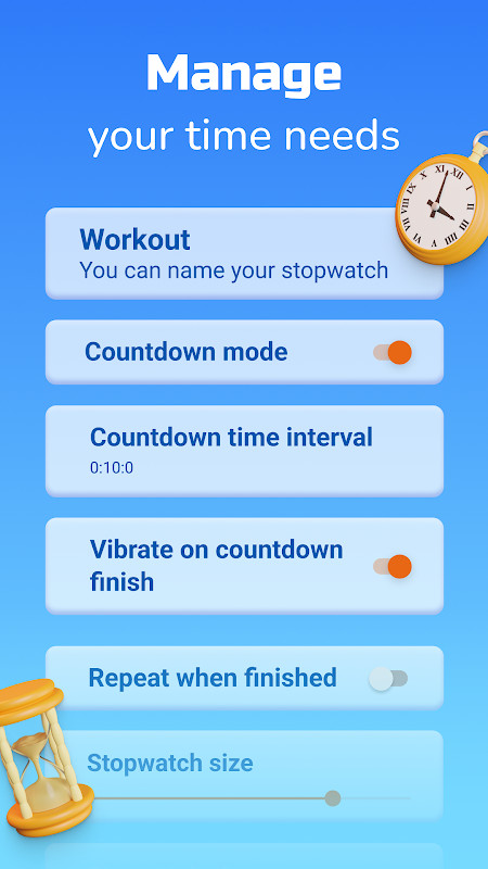 টাইমার কনফিগারেশনের মাধ্যমে, আপনি আপনার নিজস্ব স্টপওয়াচ শৈলী তৈরি করতে পারেন। এটি ব্যবহার করার জন্য আপনাকে অনলাইনে থাকতে হবে না এবং এটি পাওয়ার-সেভিং মোডে পুরোপুরি কাজ করবে।
