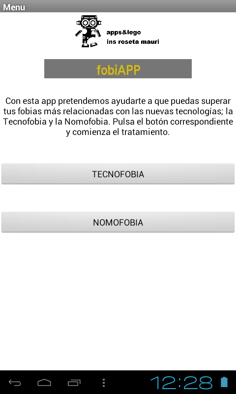 Aplicación creada por el equipo Apps&Lego con la finalidad de ayudar a las personas a superar las fobias relacionadas con las nuevas tecnologías, la Tecnofobia y Nomofobia.