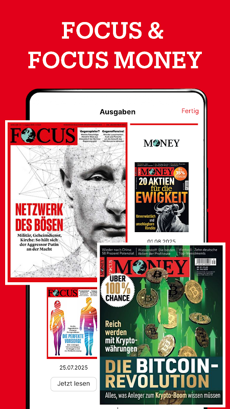 FOCUS MONEY হল আধুনিক ব্যবসা এবং ফিনান্স ম্যাগাজিন যা জার্মান অর্থনীতিতে অর্থ এবং সিদ্ধান্ত গ্রহণকারীদের জন্য আগ্রহী। ম্যাগাজিন উচ্চ অর্থনৈতিক সক্ষমতা এবং নির্ভরযোগ্যতার জন্য দাঁড়িয়েছে। প্রতি বুধবার, ম্যাগাজিনটি সামষ্টিক অর্থনৈতিক বিষয়, কোম্পানির খবর, বিনিয়োগের টিপস, কর এবং আইনের সুষম মিশ্রণের সাথে একটি সুপ্রতিষ্ঠিত এবং দরকারী পদ্ধতিতে তথ্য এবং পটভূমির তথ্য নিয়ে আসে।