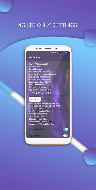 4G LTE স্যুইচ আপনাকে একটি লুকানো সেটিংস মেনু খুলতে অনুমতি দিয়ে LTE কেবল মোডে স্যুইচ করতে দেয়। এই অ্যাপ্লিকেশানটিতে আরও অনেক বৈশিষ্ট্য রয়েছে যেমন উন্নত নেটওয়ার্ক কনফিগারেশন, ব্যাটারি তথ্য, ব্যবহার তথ্য, Wi-Fi তথ্য।
