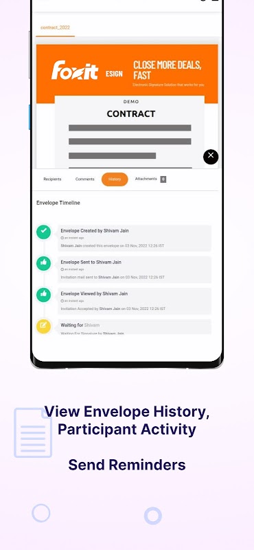 Foxit eSign হল একটি আইনত বাধ্যতামূলক eSign পরিষেবা যা ডিজিটালভাবে স্বাক্ষরিত গুরুত্বপূর্ণ নথিগুলি প্রস্তুত এবং সংগ্রহ করতে৷ এটি একটি সম্পূর্ণ eSign সমাধান প্রদান করে: আপনার নথি আপলোড করুন, আপনার টেমপ্লেট তৈরি করুন, প্রাপকদের যোগ করুন এবং পাঠান৷ Foxit eSign ওয়ার্কফ্লোগুলিকে স্বয়ংক্রিয় করে, ব্যবহারকারীদের তাদের পছন্দের ব্রাউজার বা ডিভাইস ব্যবহার করে স্বাক্ষর প্রক্রিয়া পাঠাতে, স্বাক্ষর করতে, ট্র্যাক করতে এবং পরিচালনা করার অনুমতি দেওয়ার জন্য একটি বিরামহীন প্রক্রিয়া প্রদান করে। সমাপ্তির পরে, আপনার কাছে একটি বৈধভাবে স্বাক্ষরিত নথির একটি টেম্পার-প্রুফ সংরক্ষণাগার রয়েছে৷