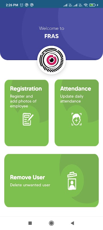 FRAS একটি মুখ স্বীকৃতি উপস্থিতি আবেদন। ম্যানেজার কর্মচারীর মুখ যোগ এবং অপসারণ করতে পারেন এবং কর্মচারী ম্যানেজার লগইন ব্যবহার করে তার উপস্থিতি নবায়ন করতে পারেন। এছাড়াও স্বতন্ত্র কর্মচারী তার/তার মুখ নিবন্ধন করতে পারে এবং কর্মচারী লগইন ব্যবহার করে তার উপস্থিতি নবায়ন করতে পারে।