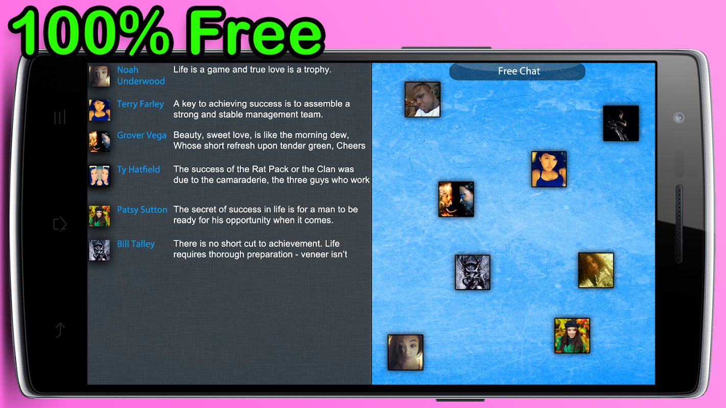 Download Free Chat today to talk with people, and make new friends from around the world. Free Chat is 100% free to use; all you need is a data plan or WiFi, and you can chat within seconds. Tired of paying for SMS? Use Free chat to send free SMS push messages to friends that also use Free Chat. Sign-up takes 10 seconds, and even faster if you use Facebook. So what are you waiting for? Download Free Chat today, and start chatting now!