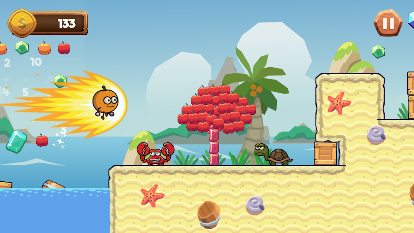 2 ডি প্ল্যাটফর্ম রানার গেম, বাধা অতিক্রম করে ফল এবং গহনা সংগ্রহ করুন।